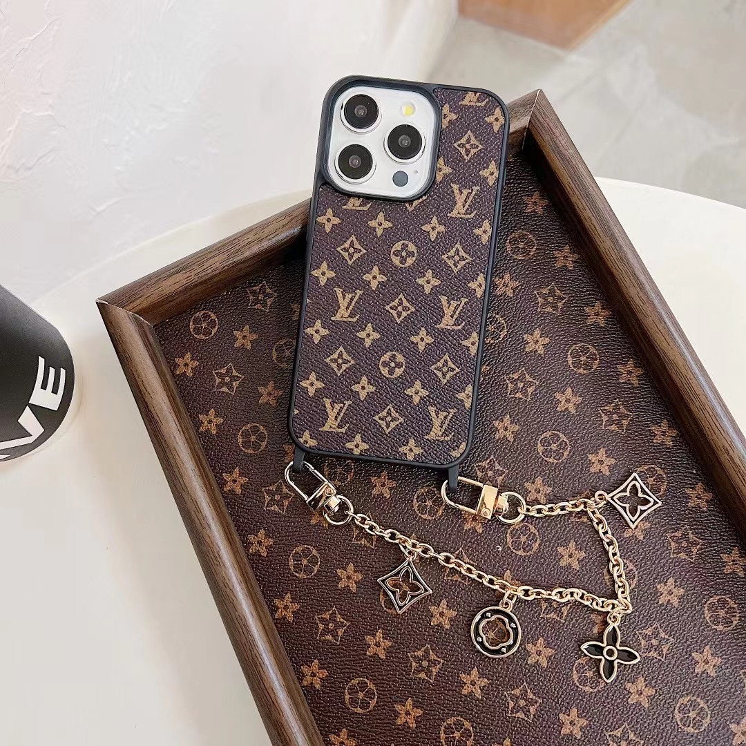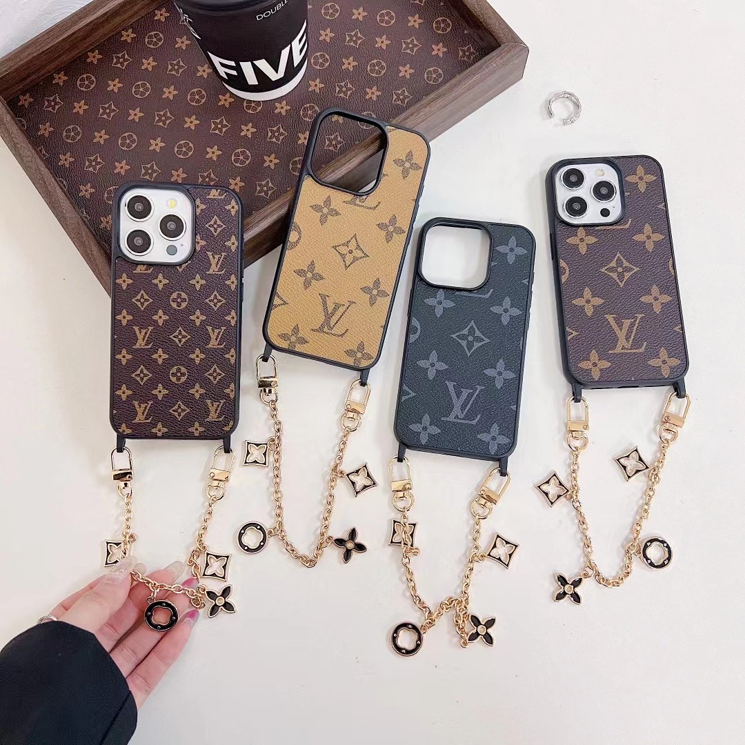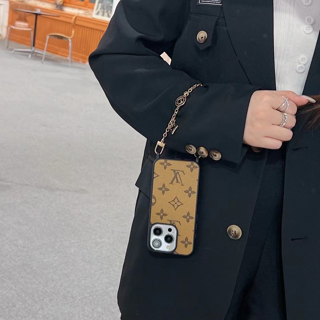 The Louis Vuitton iPhone leather case with chain holder is made from high-quality durable leather designed to protect your phone from scratches, drops, dust, and daily wear. The gold metal hand chain strap allows you to carry your phone safely while adding a luxury fashion look. The wallet card holder pocket lets you store credit cards, ID, cash, or small items.