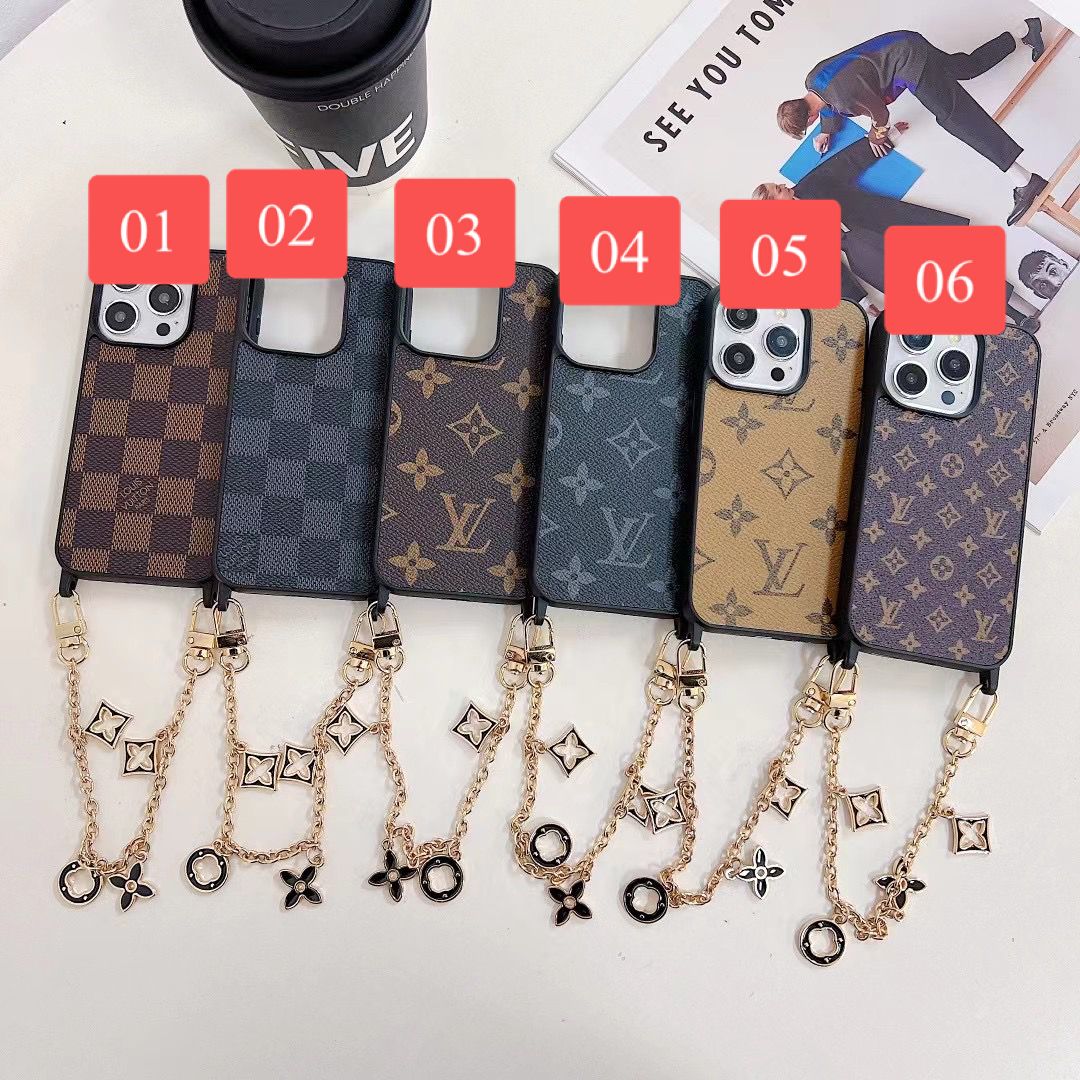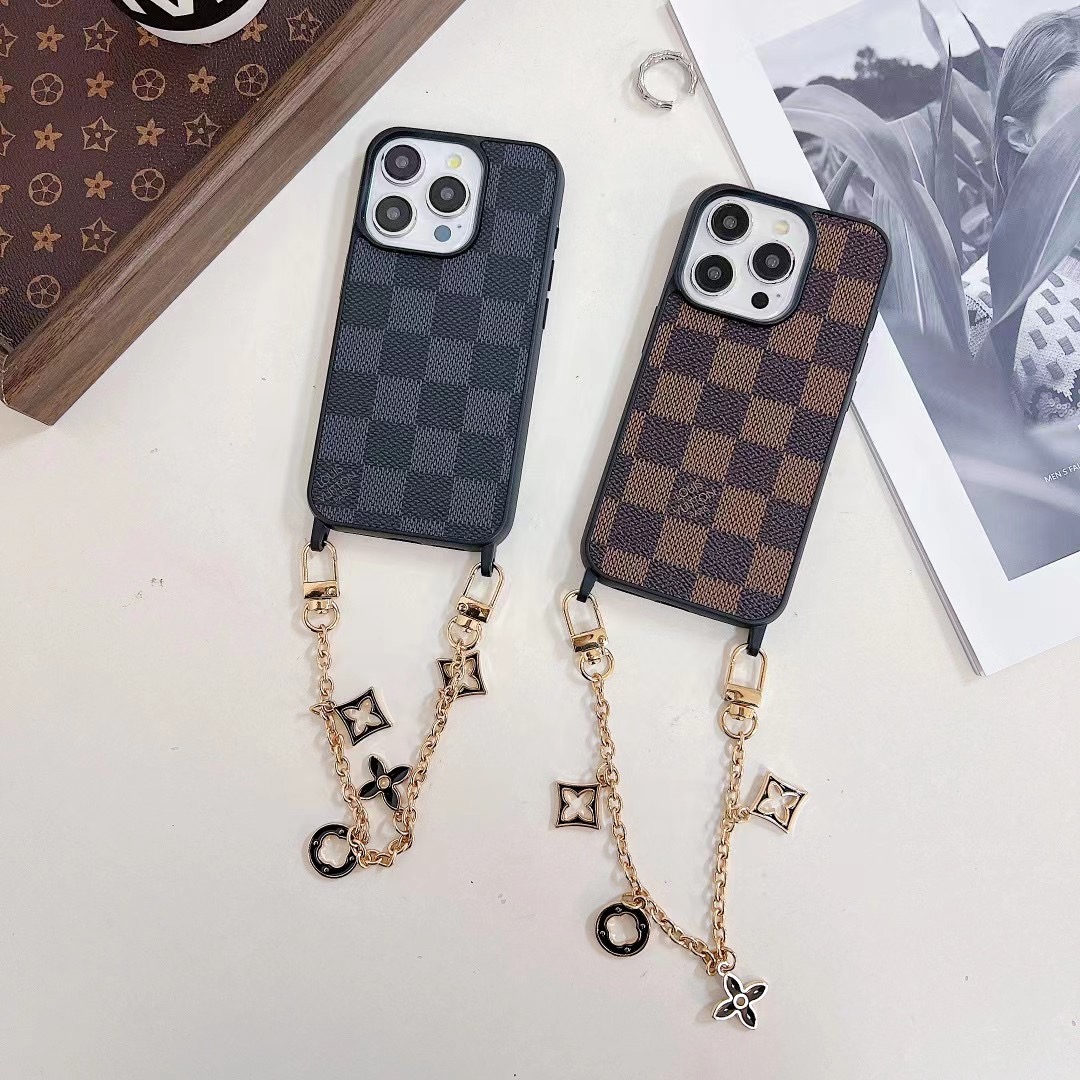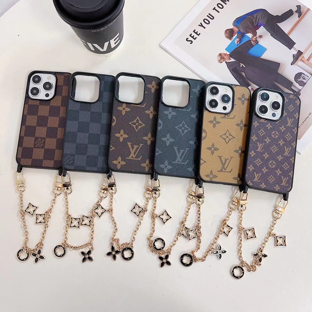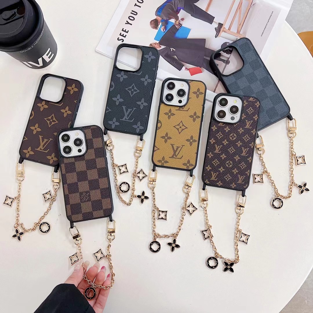 The Louis Vuitton iPhone leather case with chain holder is made from high-quality durable leather designed to protect your phone from scratches, drops, dust, and daily wear. The gold metal hand chain strap allows you to carry your phone safely while adding a luxury fashion look. The wallet card holder pocket lets you store credit cards, ID, cash, or small items.